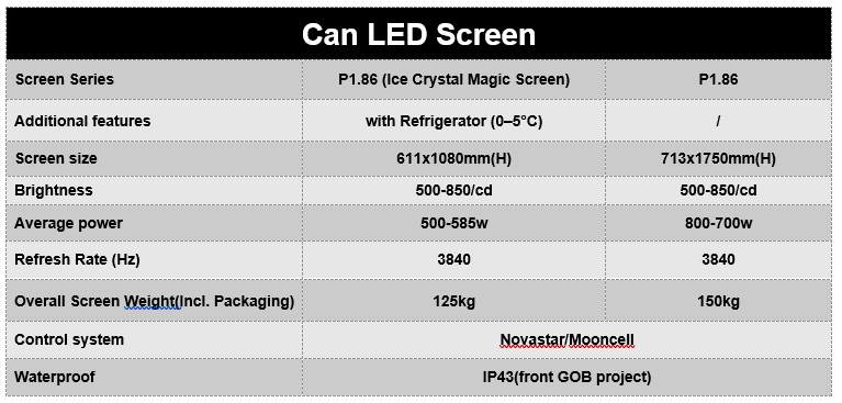 The LED Can Screen is an innovative LED display integrated with a refrigeration function. Modeled after the shape of cans (such as cola cans, beer cans, etc.), it is typically used for brand marketing, advertising displays or event venues, capturing audiences’ attention with its distinctive visual effects.